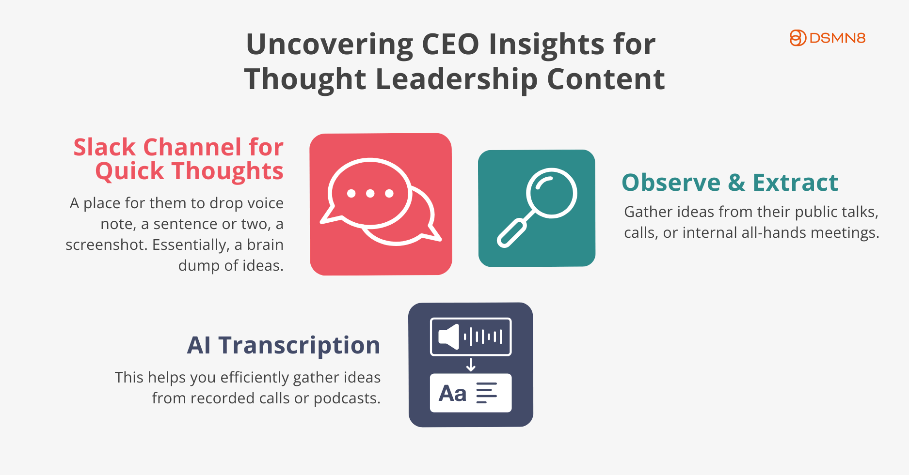 Combining the CEO Content Framework with the DSMN8 platform is an unbeatable combination. It’s time to transform CEO content management from a chore into a growth driver 📈