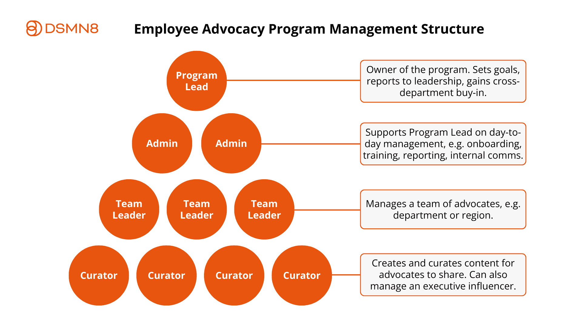 If your team struggles with content volume or lacks internal resources, DSMN8’s Managed Services can support content creation and curation to keep your program active.