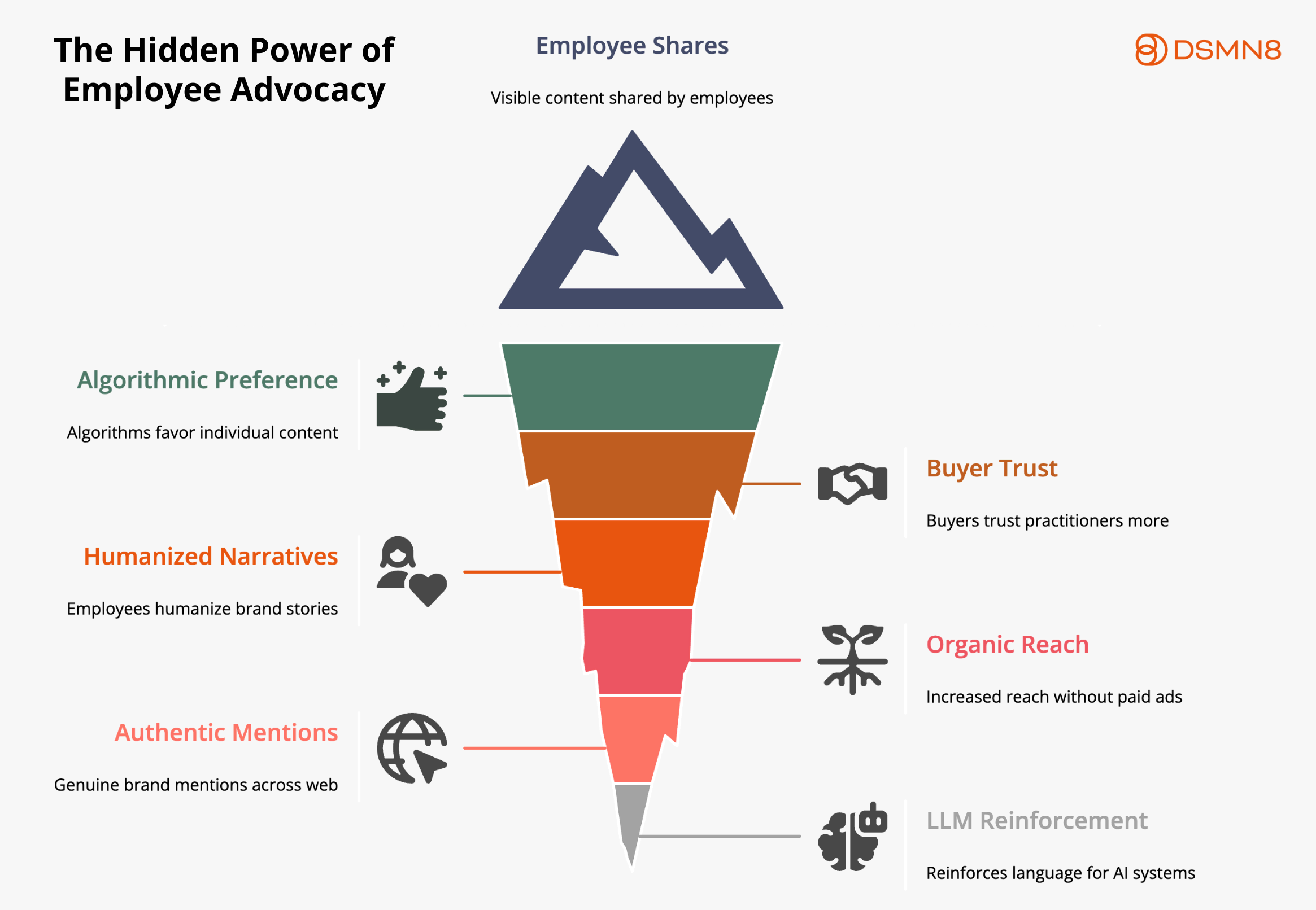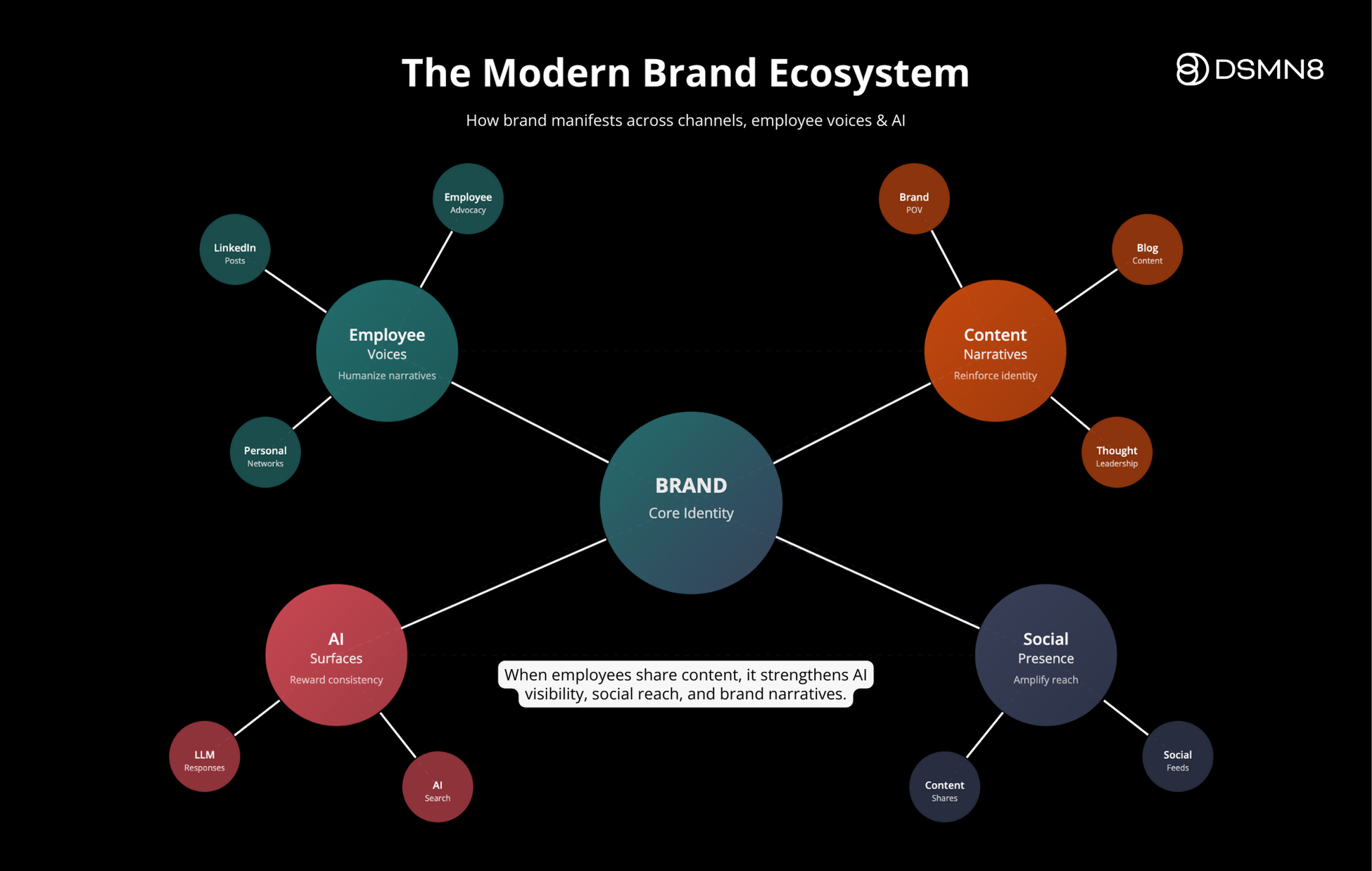 When employees share, they humanize your brand, increase reach organically, create authentic brand mentions across the web, and reinforce the narrative and positioning LLMs rely on.