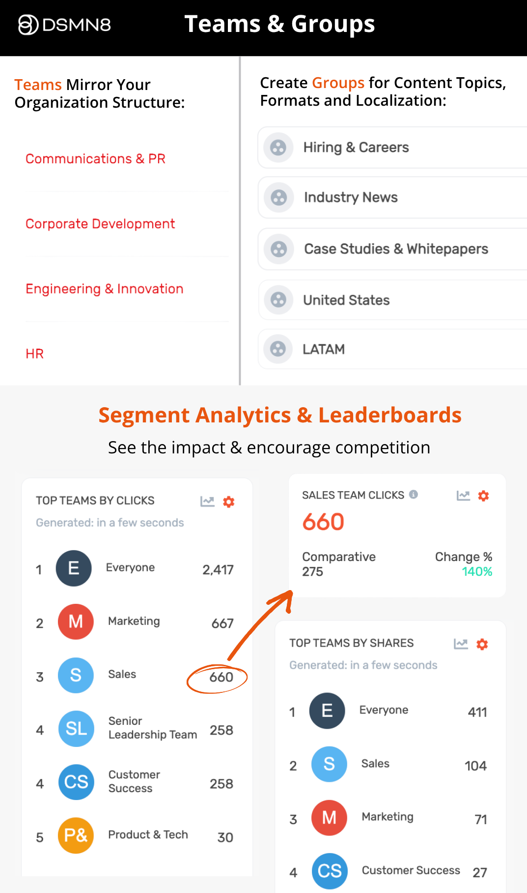 Segment your reporting by team to see exactly which groups are sharing the most and driving the highest engagement.