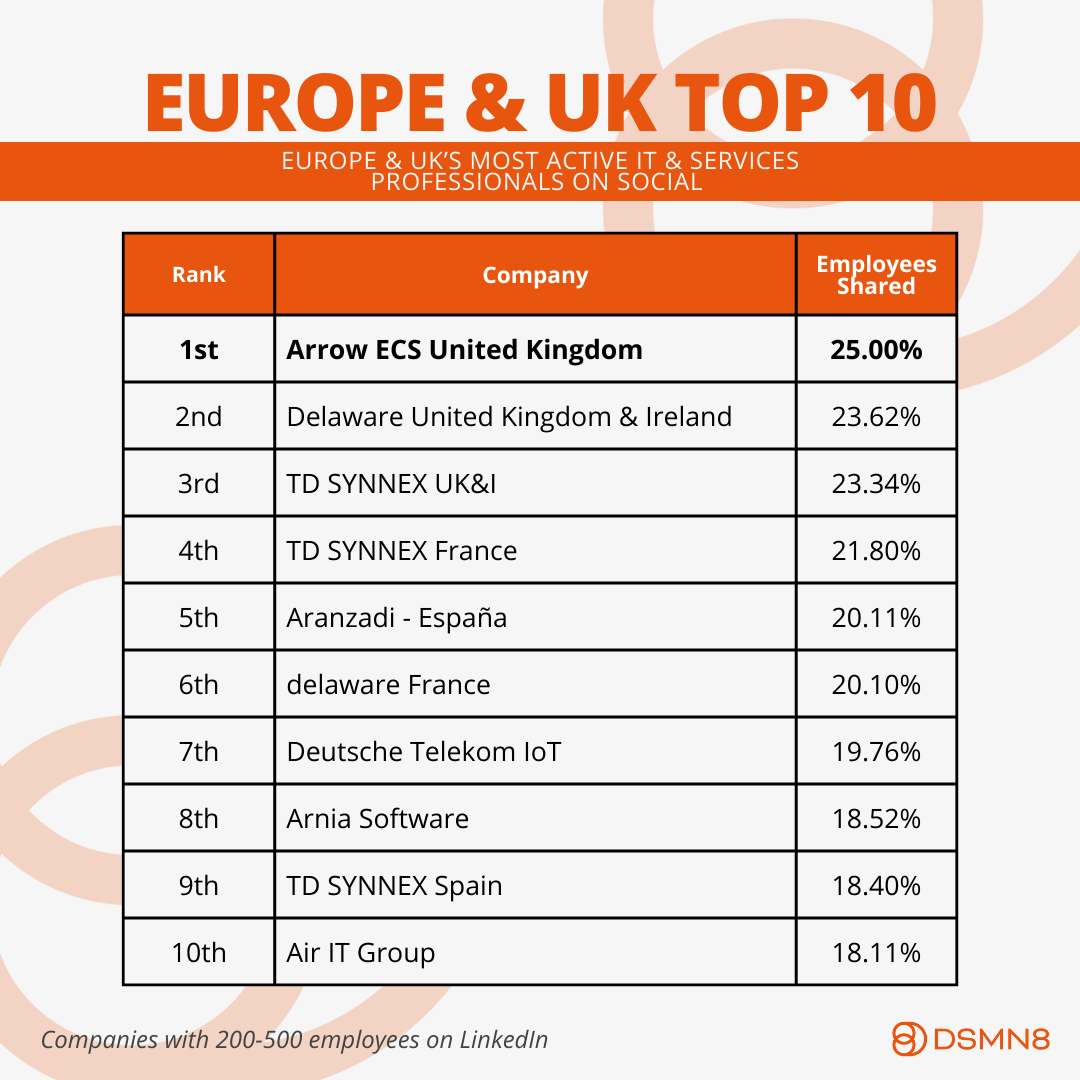 💥 Europe & UK's #1 organization, Arrow ECS United Kingdom, had an impressive 25.00% of employees sharing content.