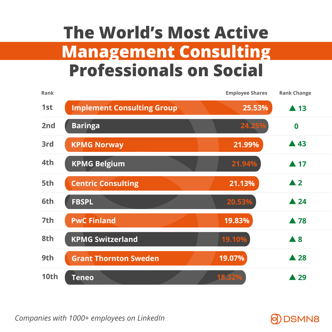 💥 The Global #1 organization, Implement Consulting Group, had an impressive 25.53% of employees sharing content.