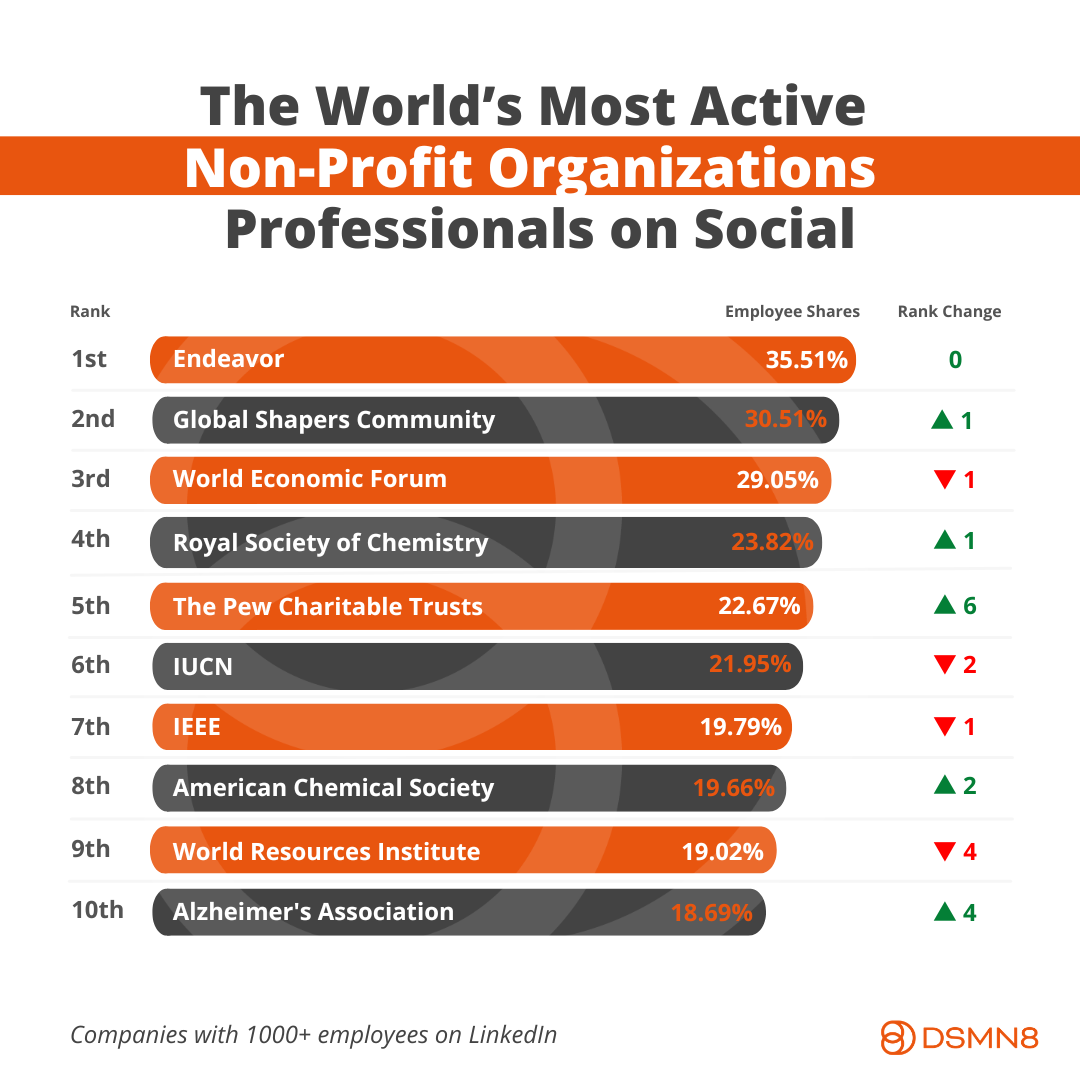 💥 The Global #1 non-profit organization, Endeavor, had an impressive 35.51% of employees sharing content.