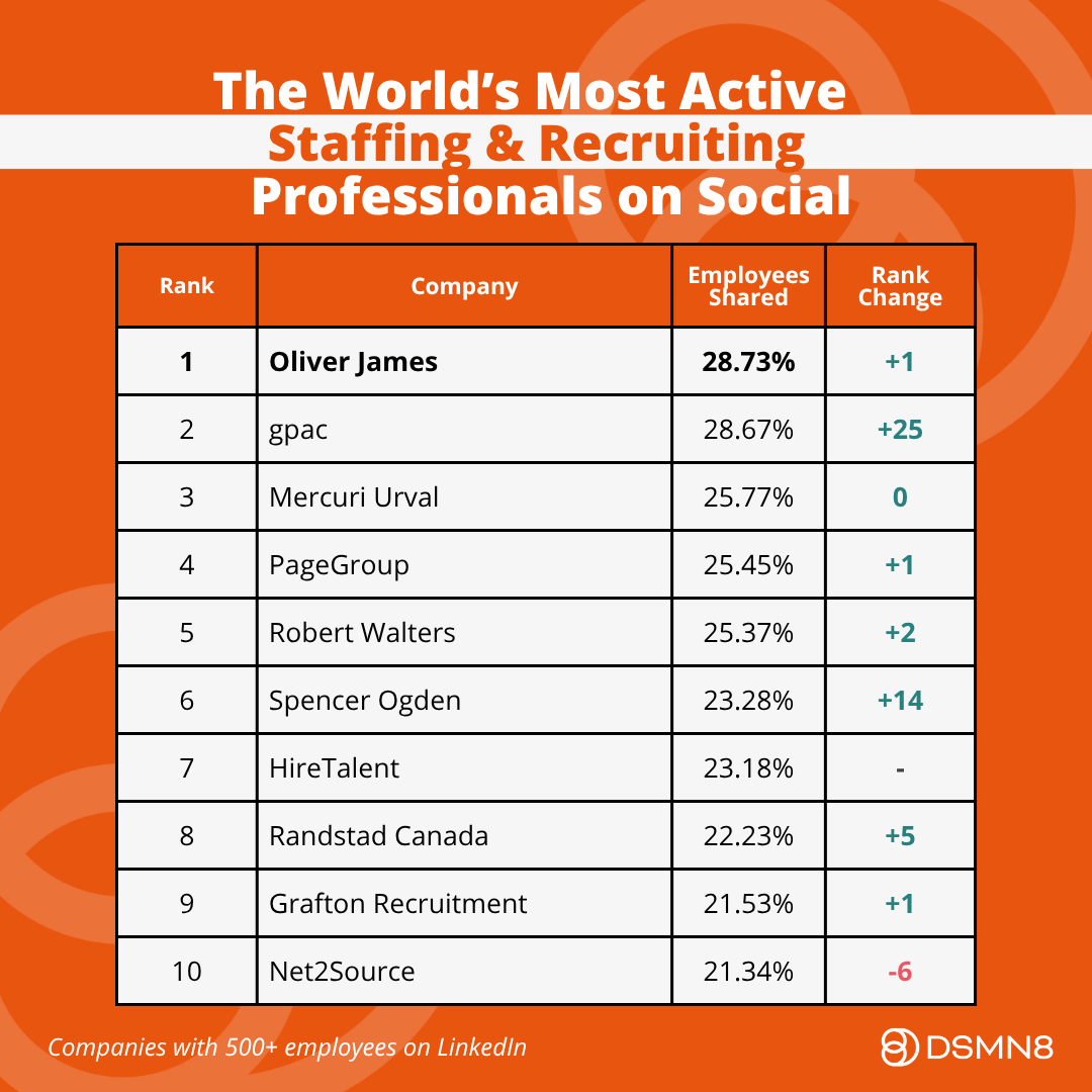💥 The Global #1 organization, Oliver James, had an impressive 28.73% of employees sharing content.
