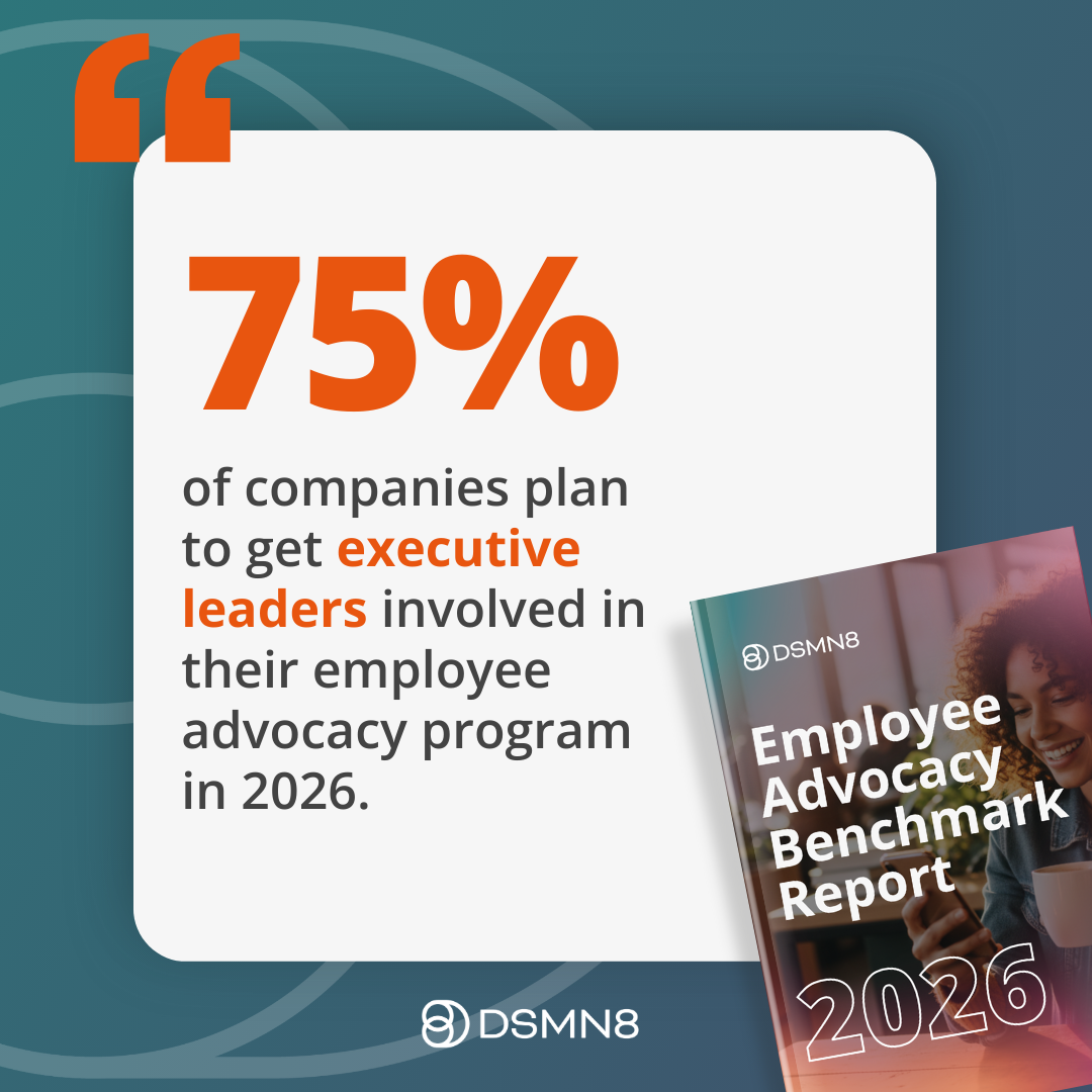 DSMN8’s 2026 Employee Advocacy Benchmark Report shows 79.5% of programs now involve senior executives, and it’s the top priority for programs looking to boost engagement this year.