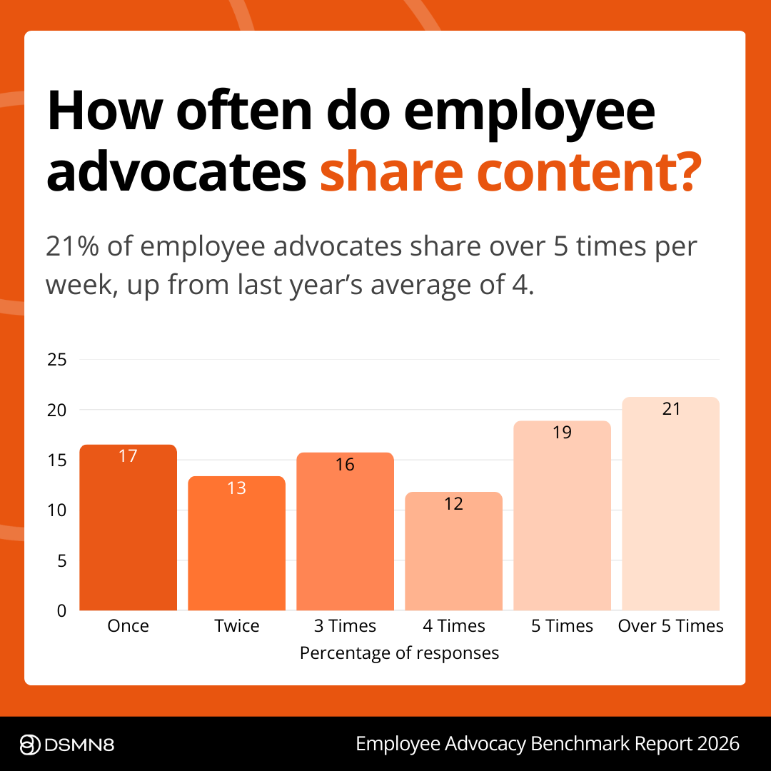 DSMN8’s 2026 Employee Advocacy Benchmark Report shows 21% of advocates now share content over 5 times per week, up from an average of 4 shares last year.